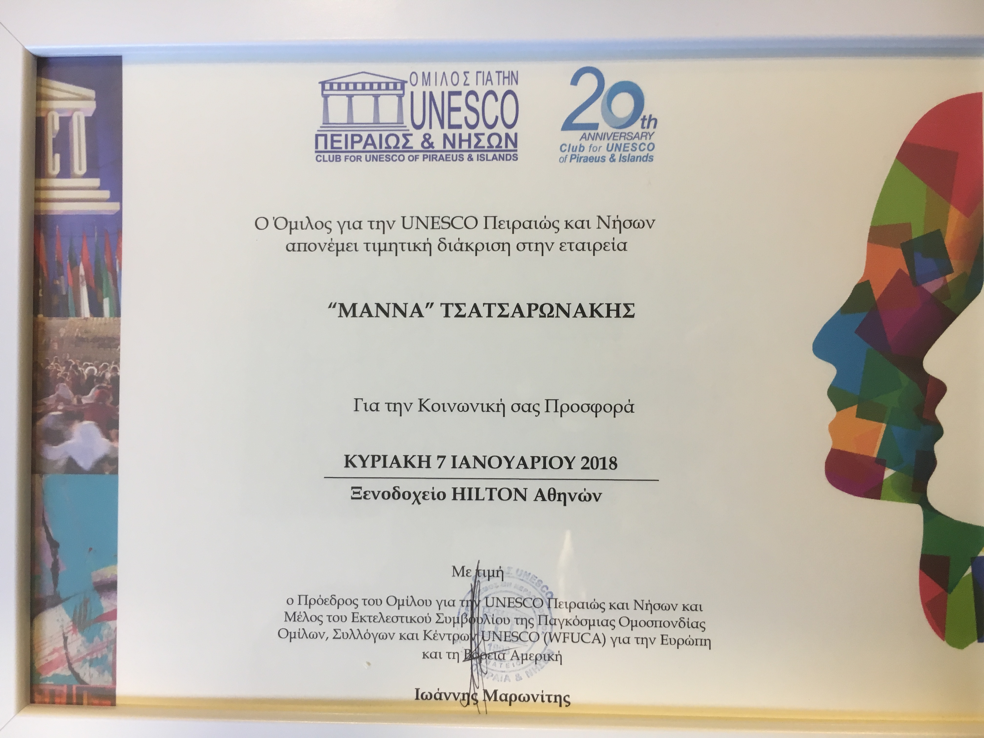 Για άλλη μια φορά, η εταιρεία “το Μάννα” Τσατσαρωνάκη ξεχώρισε για την κοινωνική της προσφορά. Στις 3 Οκτωβρίου, είχαμε την τιμή να βραβευτούμε από τον Οικουμενικό Πατριάρχη Βαρθολομαίο, για την προσφορά μας στην τοπική κοινωνία, σε επίσημο δείπνο στο Τσατσαρωνάκειο Πολύκεντρο, στα Χανιά.
